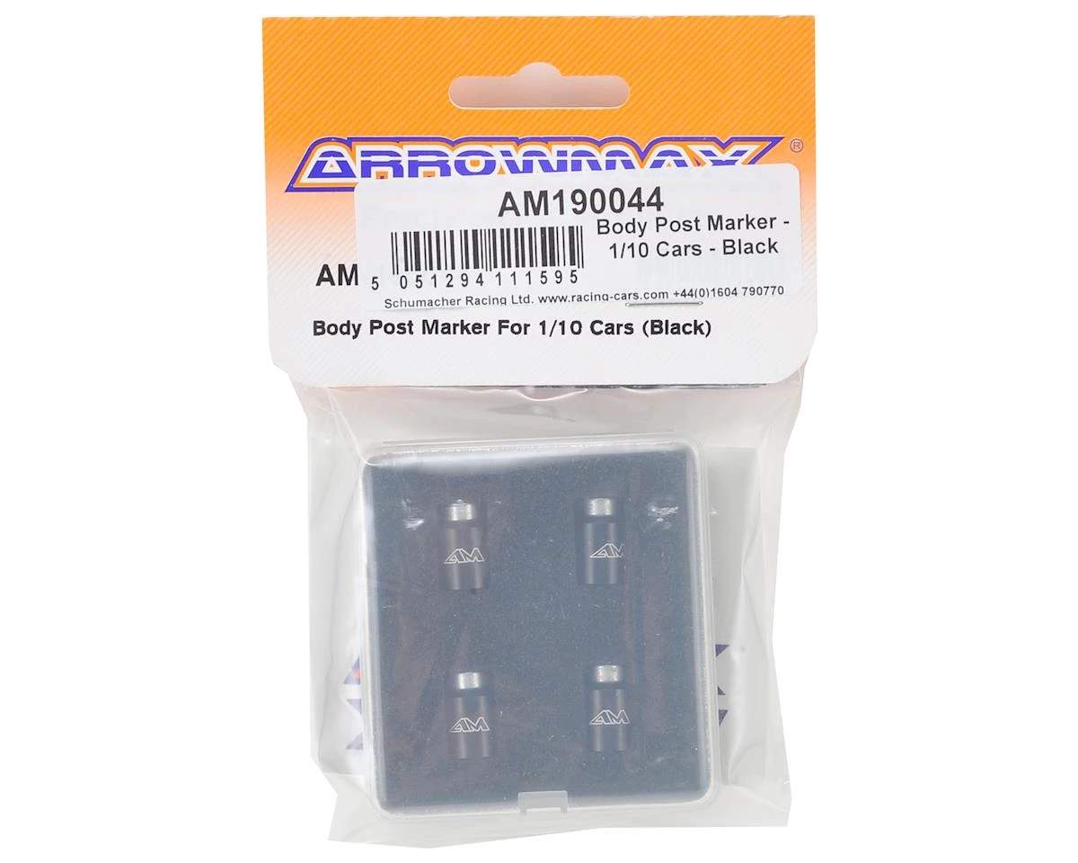 Arrowmax 1/10 Body Post Markers are compatible with all 1/10 cars that utilize a 6mm body post. The tools are easy to use, use a magnet for fixture alignment, and will make it easier to correctly align your body on your chassis. These are especially useful when the body is painted and you cannot see through to make markings. Package includes a set of four markers, and are available in Grey, Red or Black.
