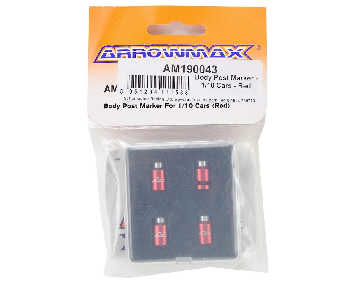 Arrowmax 1/10 Body Post Markers are compatible with all 1/10 cars that utilize a 6mm body post. The tools are easy to use, use a magnet for fixture alignment, and will make it easier to correctly align your body on your chassis. These are especially useful when the body is painted and you cannot see through to make markings. Package includes a set of four markers, and are available in Grey, Red or Black.