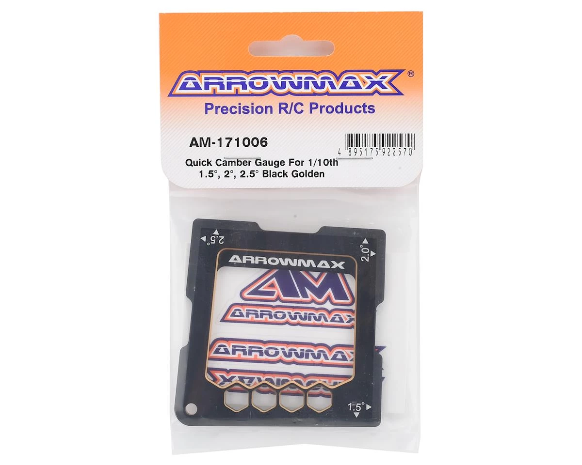 The Arrowmax 1/10 On Road Quick Camber Gauge is an easy to use camber gauge for 1/10th on road vehicles. Designed for quick and easy camber angle checks the 1-piece gauge allows to measure angles of 1.5, 2.0 and 2.5 degree by simply placing the gauge alongside the wheel. The tool is made from CNC-machined aluminium, with a Honeycomb-design and black and golden surface treatment. It has been laser-engraved for easy identification while milled-out sections make way for the wheel nuts.
