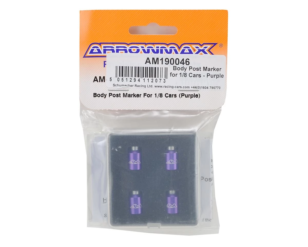 Arrowmax 1/8 Body Post Markers are compatible with all 1/8 cars that utilize a 7mm body post. The tools are easy to use, use a magnet for fixture alignment, and will make it easier to correctly align your body on your chassis. These are especially useful when the body is painted and you cannot see through to make markings. Package includes a set of four markers.