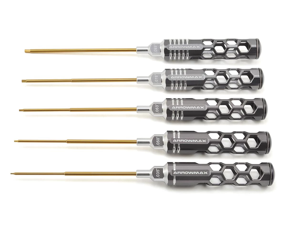 The Arrowmax Allen Wrench Set V2 include the most common SAE sizes, and feature an eye-catching, light weight, hollow honeycomb handle design. The 120mm long tips are spring steel and titanium nitride coated for durability. When combined with the lexan cap, you get a comfortable, controllable and lighter feeling tool that makes wrenching easier.