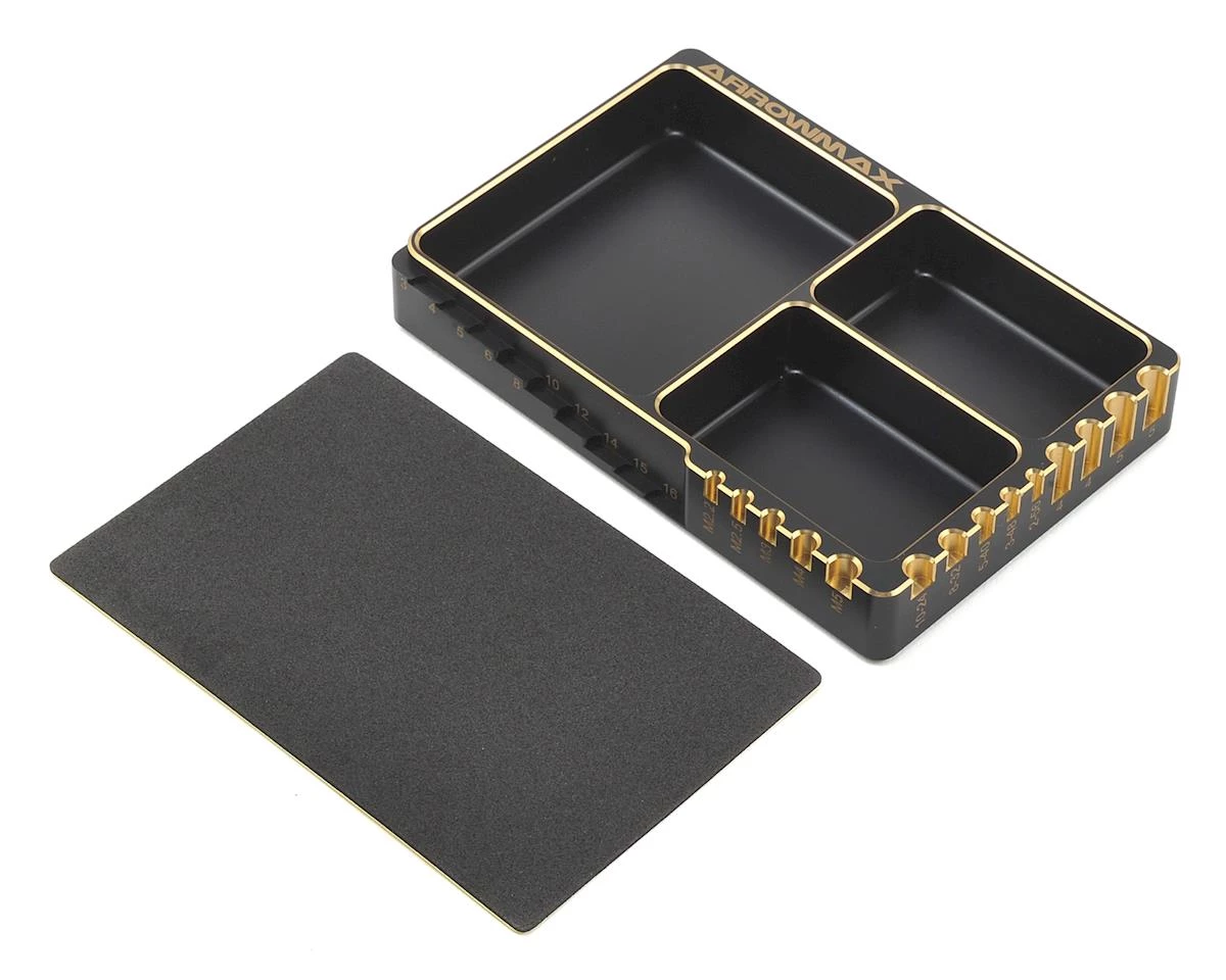 The Arrowmax Aluminum Black Golden Parts Tray is a must have for any build. This machined aluminum case if perfect for sorting small parts, measuring screw length from 3 to 16mm, and diameter from M2.2 to M5 in metric measurements, as well as SAE diameter from 2-56 to 10-24. The tray has a 120x80mm footprint, provides three separate compartments, one large 68x56mm, one 37x53mm, one 32x53mm, and all are 15mm deep. Plus, it includes two 4mm and two 5mm slots to hold female and male bullet connectors during soldering. Add in the black and gold anodized finish, and you have a striking must have addition to your tool collection.Â