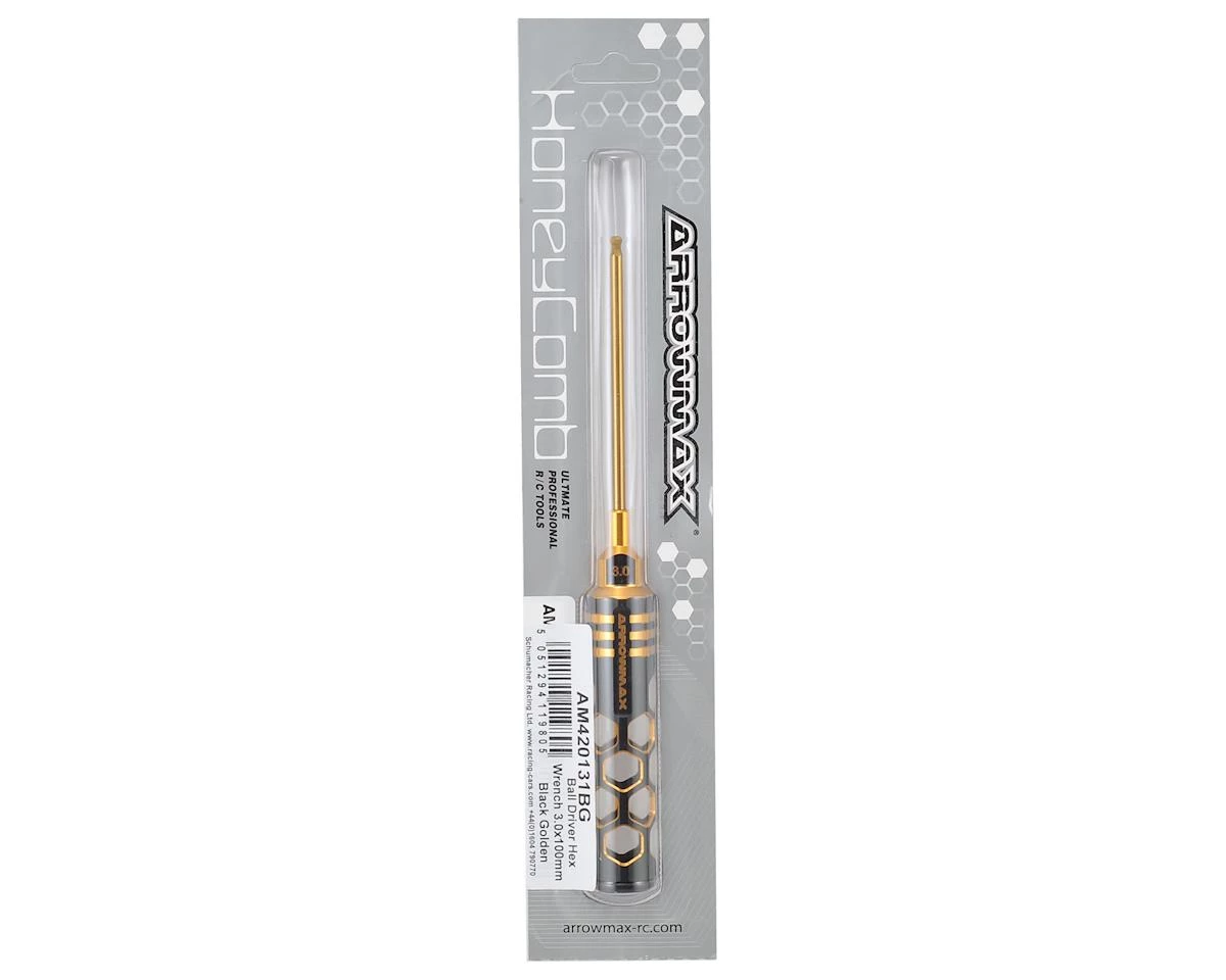 The Arrowmax Black Golden Ball End Hex Wrench is a limited edition tool that features an eye-catching hollow honeycomb handle design with a rich black and gold color finish. The 100mm long spring steel titanium nitride tip provides durability and long life, while a lexan end cap helps to create a more comfortable, controllable and lighter feeling tool that makes it easier to endure a long wrenching session. Package includes one 3mm ball end hex wrench.