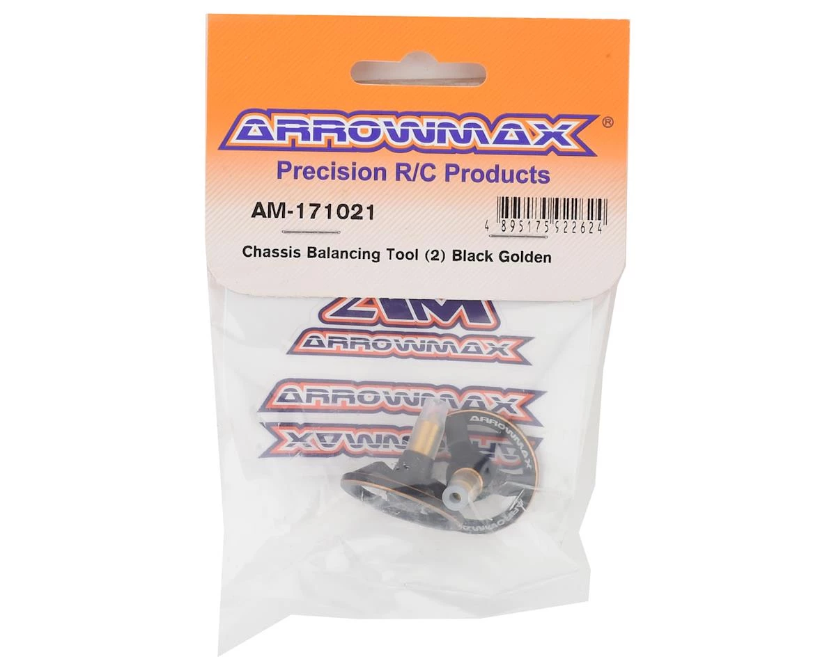 The Arrowmax Black Golden Chassis Balancing Tool makes it easier to achieve a perfectly balanced side-to-side RC car. On most touring car chassis, there will be small dimples or holes in the center on the front and rear. Simply install the tools into these spaces and then add/remove weight as needed until perfect left/right balance is achieved.
