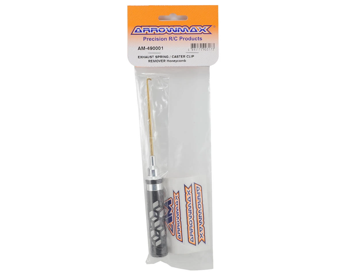 This is the Arrowmax Honeycomb Exhaust Spring/Clip Remover. Arrowmax tools feature an eye-catching, light weight, hollow honeycomb handle design. The tips are spring steel and titanium nitride coated for durability. When combined with the lexan cap, you get a comfortable, controllable and lighter feeling tool that makes wrenching easier.