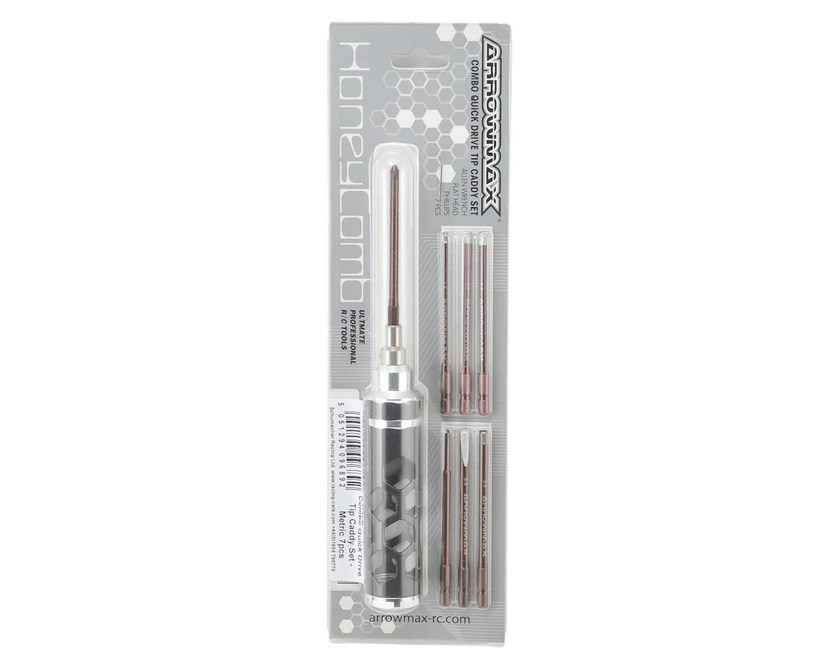 The Arrowmax Quick Drive Metric Tip Caddy Combo Set includes the four most common hex tips, as well as Phillips head and flat head screw drivers, all in 4mm drive, making them compatible with a power drill. A honeycomb machined handle is also included to allow you to use any of the tips like a standard hand tool.Â