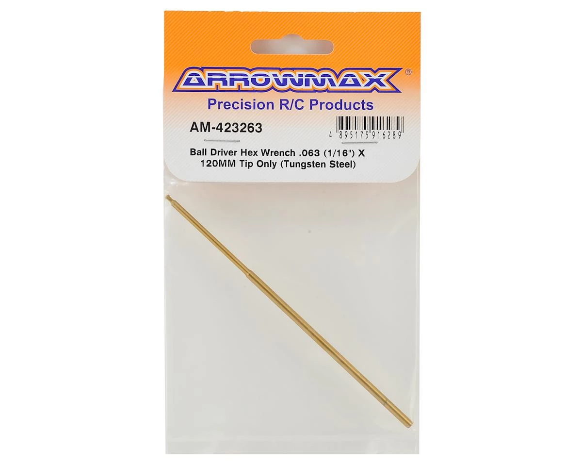 Arrowmax Tungsten Steel Replacement Ball End Hex Wrench Tip. This tip is machined from tungsten steel and has been ti-nitride coated for durability. Tip features a 120mm long shaft, with a 1/16″ ball tip.Â