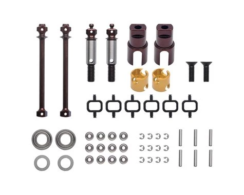 The AM Arrowmax XRAY T4 53mm Ball-Bearing DJC Driveshaft Set offer a significant performance gain over the standard blade-type driveshafts. The ball-bearings slide into the drive cups to reduces free-play and thus increases longevity. The reduced friction helps to increase acceleration and corner speed. Package includes one ball-bearing DJC driveshaft set.
