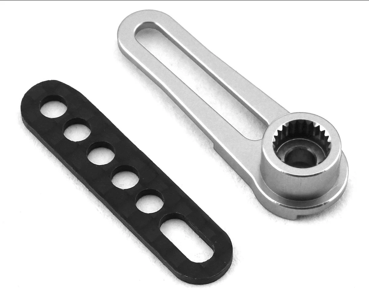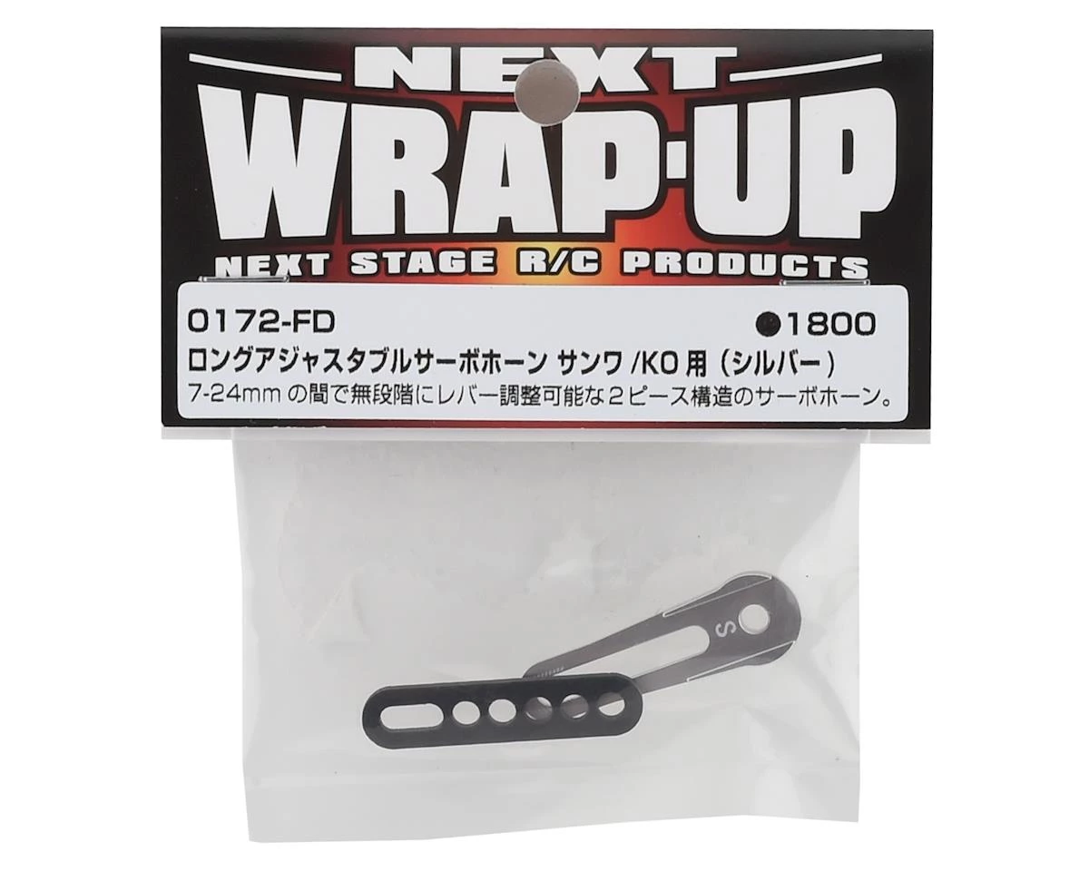 This is a WRAP-UP NEXT 23T Aluminum Long Adjustable Servo Horn, intended for use with Sanwa and KO Propo servos that use a 23T output. This lightweight aluminum horn is anodized a bright silver, with a second piece cut from quality carbon fiber for adjustments.