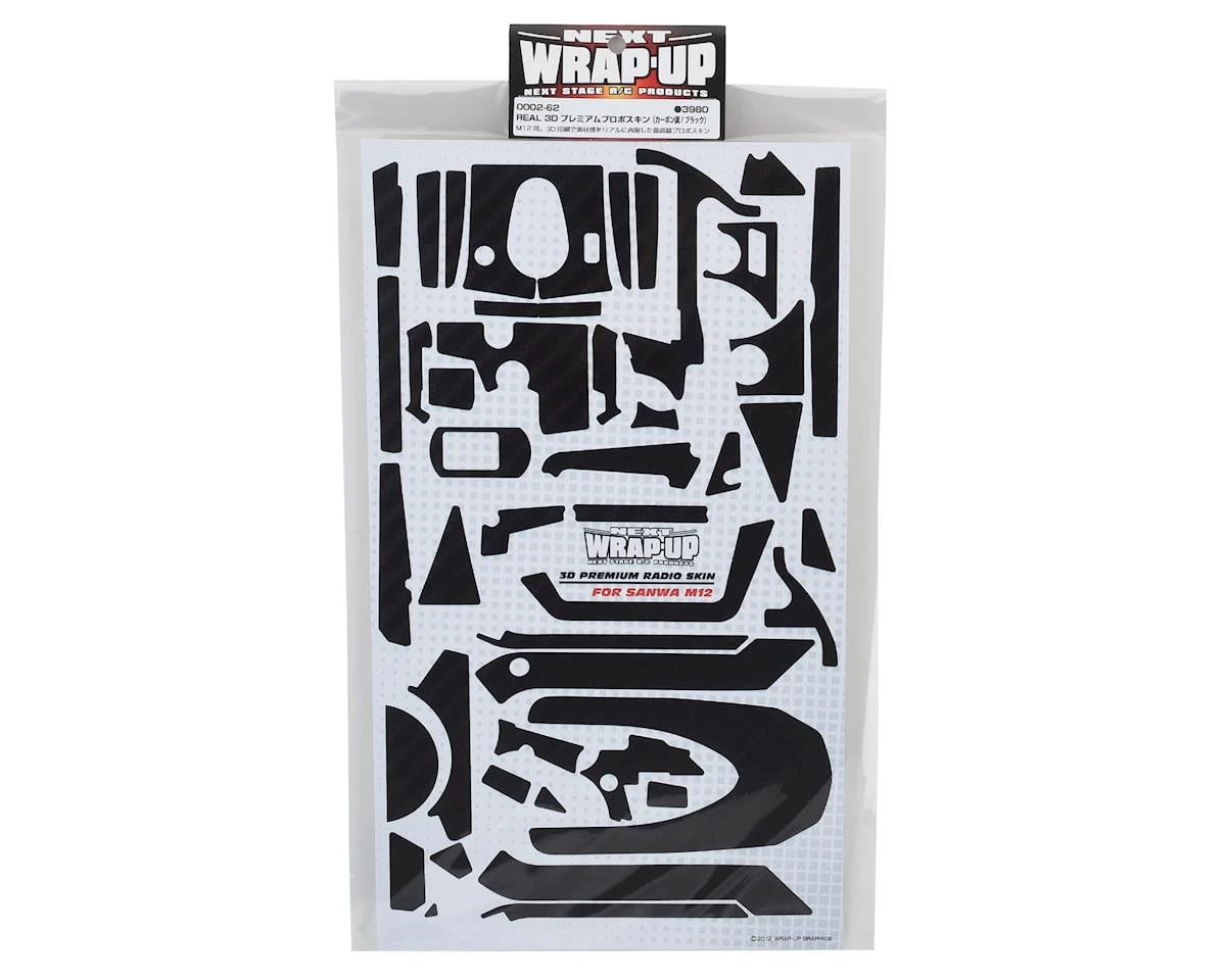 This is a WRAP-UP NEXT REAL 3D Premium M12 Transmitter Black Carbon Skin, a textured set of decals to add depth and style to your boring old radio. This decal sheet has 3D effects for a greater depth of detail, giving the skin a carbon texture.