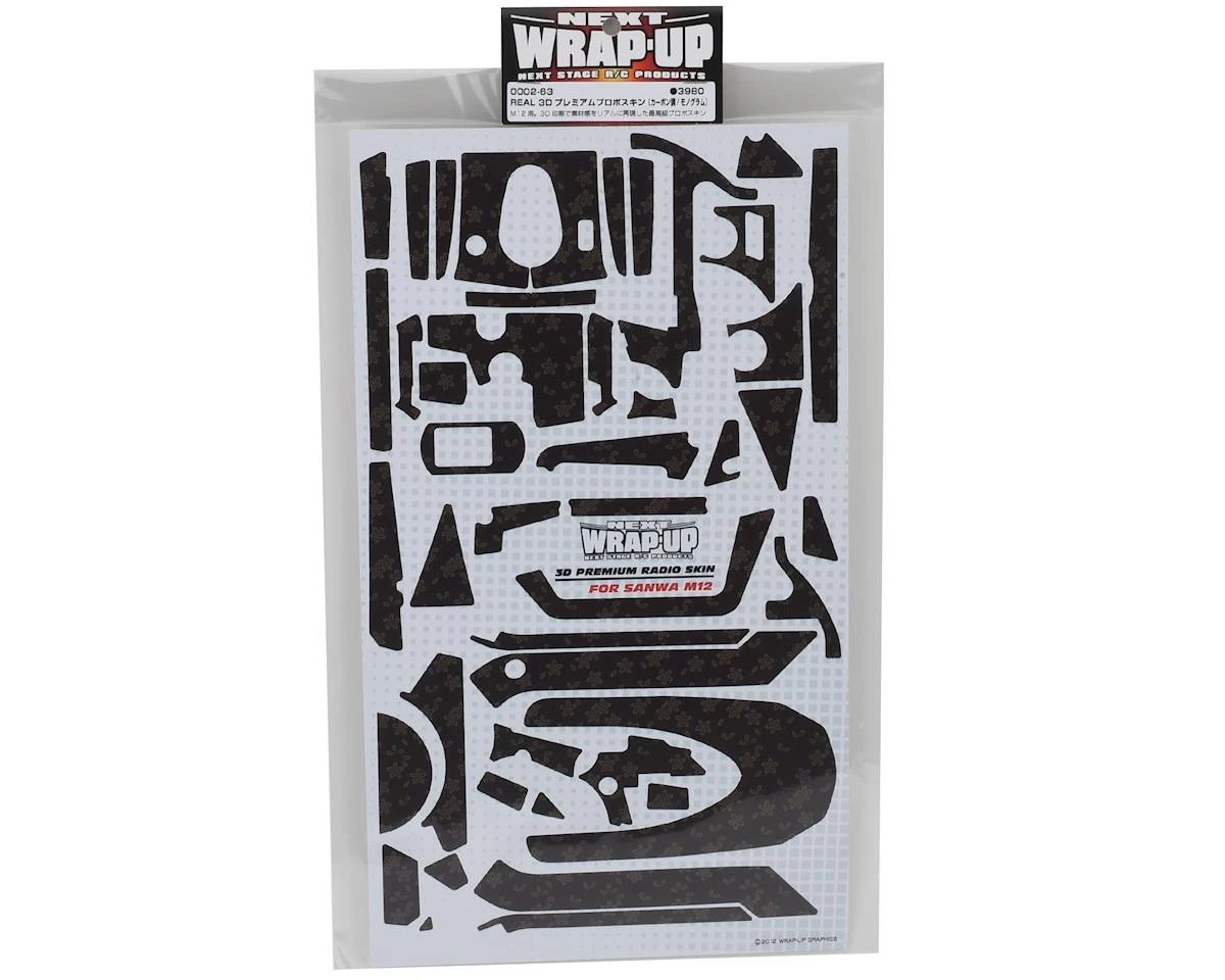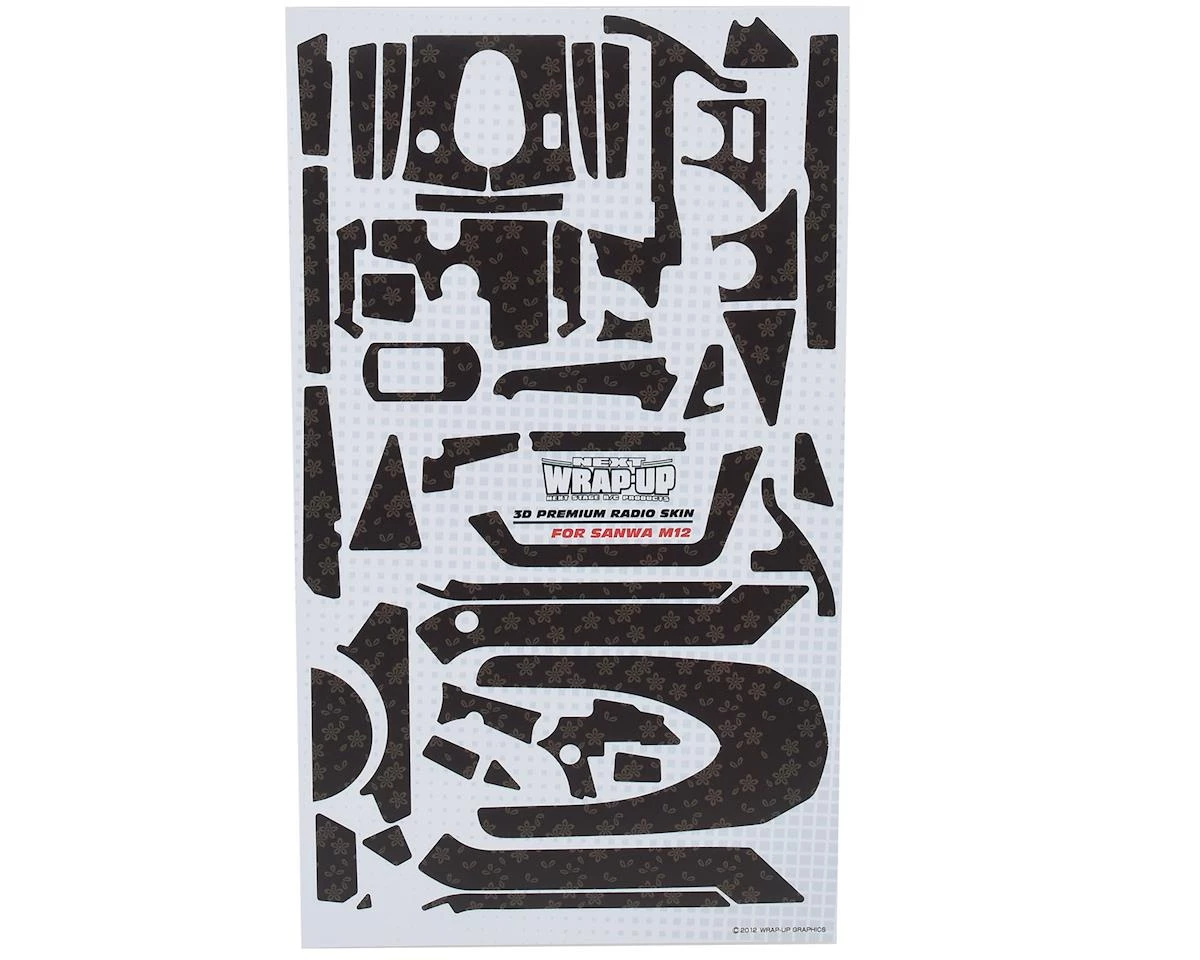 This is a WRAP-UP NEXT REAL 3D Premium M12 Transmitter Monogram Carbon Skin, a textured set of decals to add depth and style to your boring old radio. This decal sheet has 3D effects for a greater depth of detail, giving the skin a carbon texture. These decals have a carbon texture with an underlying floral pattern.