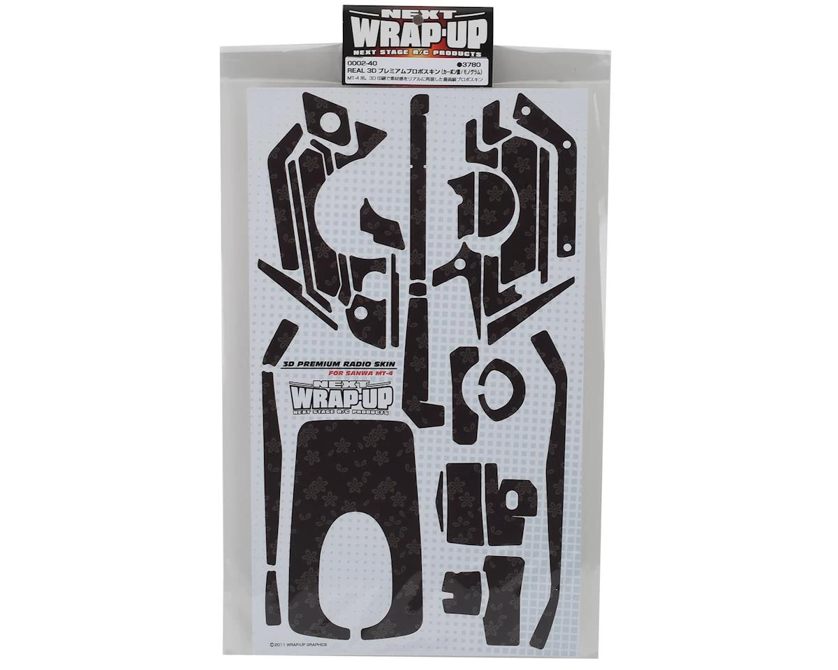 This is a WRAP-UP NEXT REAL 3D Premium MT-4Â Transmitter Monogram Carbon Skin, a textured set of decals to add depth and style to your boring old radio. This decal sheet has 3D effects for a greater depth of detail, giving the skin a quality texture. These decals have a carbon texture with an underlying floral pattern.