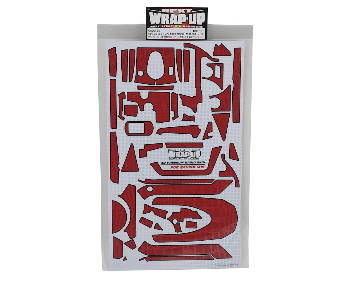 This is a WRAP-UP NEXT REAL 3D Premium M12 Transmitter Red Crocodile Skin, a textured set of decals to add depth and style to your boring old radio. This decal sheet has 3D effects for a greater depth of detail, making the crocodile skin texture seem alive.