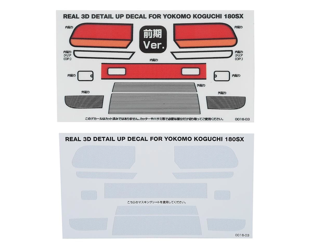 This is a WRAP-UP NEXT REAL 3D YOKOMO KOGUCHI 180SX Detail Up Decal Style 1- Zenki, a decal to add realism to your RC drift set up. This decal sheet has 3D effects, making them lightly textured to add further depth and details, especially when used with installed LEDS (not included). This set realistically reproduces the unevenness of the grille and the lens cut of the light, effects that could not be expressed with normal decals, to achieve the highest reality. Comes with pre-cut special masking to make application simple.