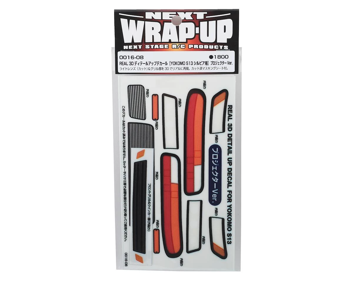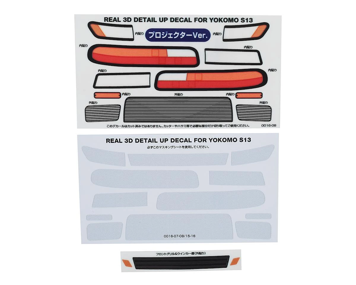 This is a WRAP-UP NEXT REAL 3D YOKOMO S13 SILVIA Detail Up Decal with Projector Lenses, a decal to add realism to your rc drift set up. This decal sheet has 3D effects, making them lightly textured to add further depth and details, especially when used with installed LEDS (not included). This set realistically reproduces the unevenness of the grille and the lens cut of the light, effects that could not be expressed with normal decals, to achieve the highest reality. Comes with pre-cut special masking to make application simple.