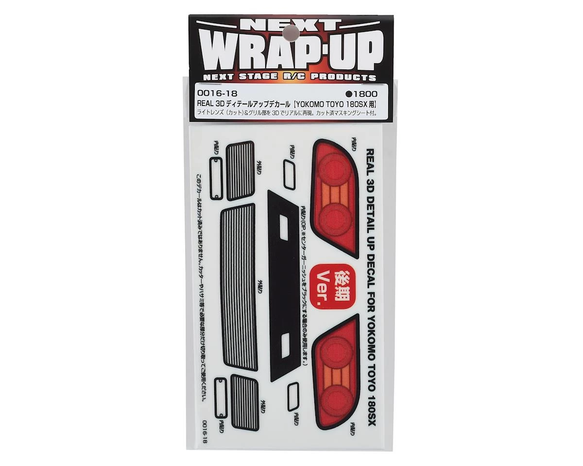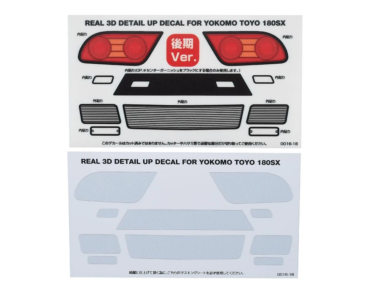 This is a WRAP-UP NEXT REAL 3D Yokomo TOYO 180SX Detail Up Decal Style 2- Kouki, a decal to add realism to your RC drift set up. This decal sheet has 3D effects, making them lightly textured to add further depth and details, especially when used with installed LEDS (not included). This set realistically reproduces the unevenness of the grille and the lens cut of the light, effects that could not be expressed with normal decals, to achieve the highest reality. Comes with pre-cut special masking to make application simple.