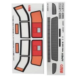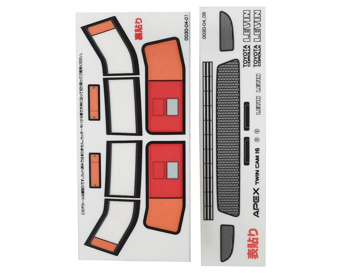 This is a WRAP-UP NEXT Spare TOYOTA AE86 LEVIN BODY Zenki Decal Set, a decal set that can be used to replace scratched and torn decals on your Yokomo Toyota AE86 Levin that is equipped with a WRAP-UP Zenki decal kit. This decal sheet has 3D effects, making them lightly textured to add further depth and details, especially when used with installed LEDS (not included). This set realistically reproduces the unevenness of the grille and the lens cut of the light, effects that could not be expressed with normal decals, to achieve the highest reality.