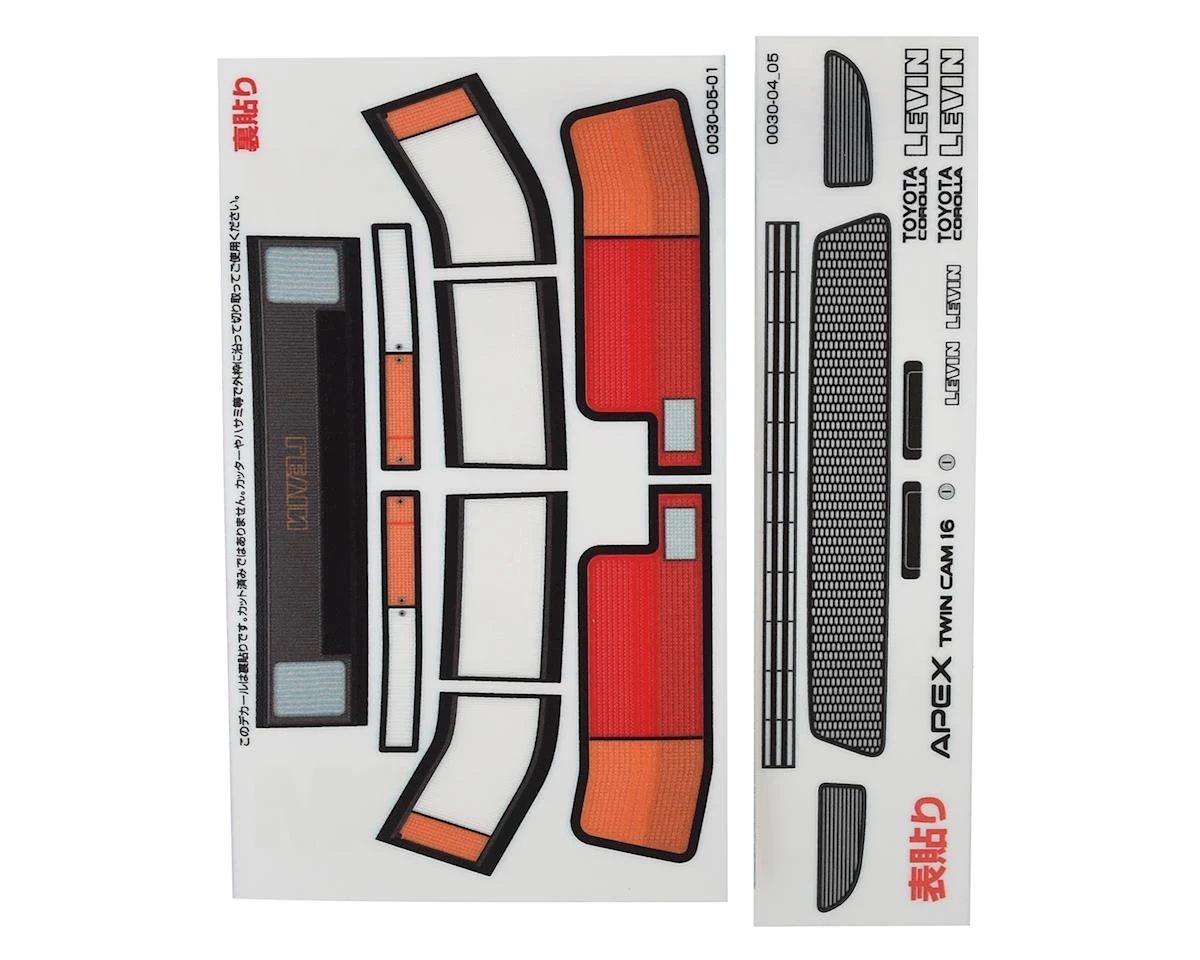 This is a WRAP-UP NEXT Spare TOYOTA AE86 LEVIN BODY Kouki Decal Set, a decal set that can be used to replace scratched and torn decals on your Yokomo Toyota AE86 Levin that is equipped with a WRAP-UP Kouki decal kit. This decal sheet has 3D effects, making them lightly textured to add further depth and details, especially when used with installed LEDS (not included). This set realistically reproduces the unevenness of the grille and the lens cut of the light, effects that could not be expressed with normal decals, to achieve the highest reality.