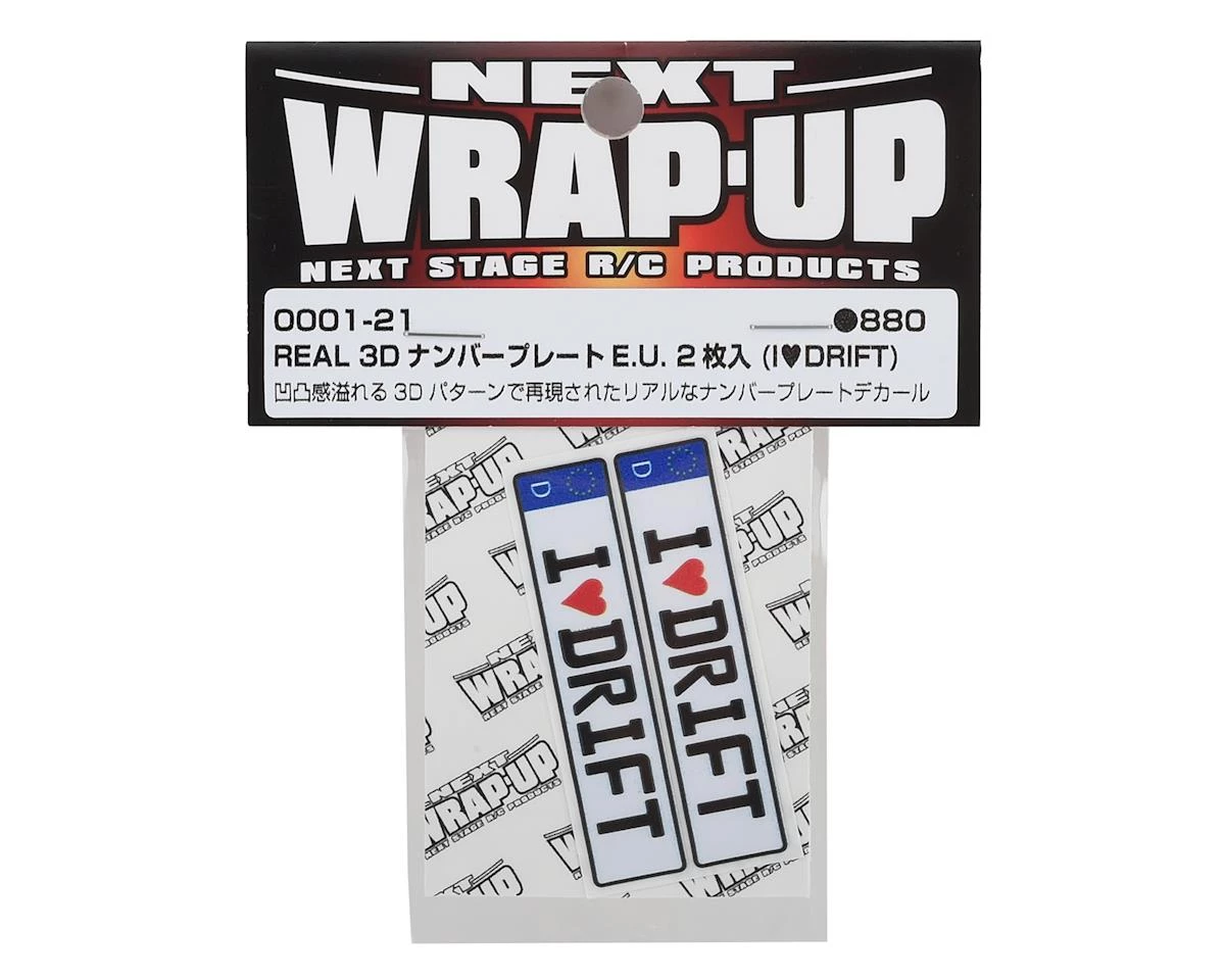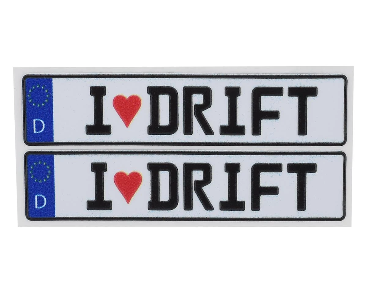 This is a set of two WRAP-UP NEXT REAL 3D E.U. License Plates with I LOVE DRIFT text, realistic textured decals of an Euro style license plate that can add scale depth to your RC drift car. The decal has been printed with 3D effects, giving it dimensions and details to the finished product. The license plates dimensions are 11x50mm (.5x2in).