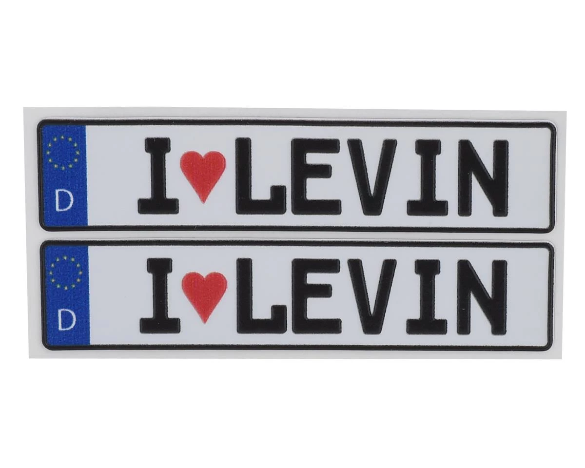 This is a set of two WRAP-UP NEXT REAL 3D E.U. License Plates with I LOVE LEVIN text, realistic textured decals of an Euro style license plate that can add scale depth to your RC drift car. The decal has been printed with 3D effects, giving it dimensions and details to the finished product. The license plates dimensions are 11x50mm (.5x2in).