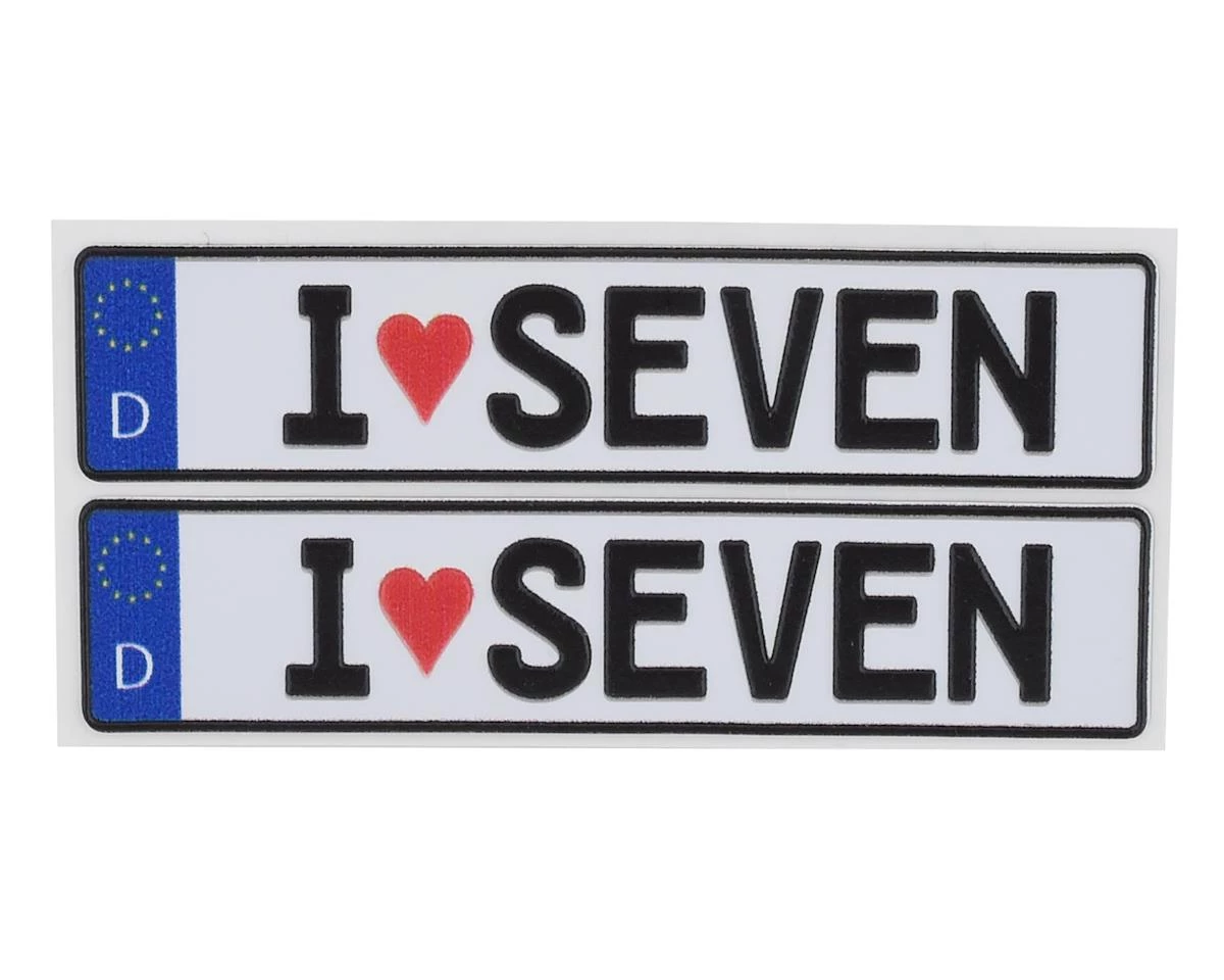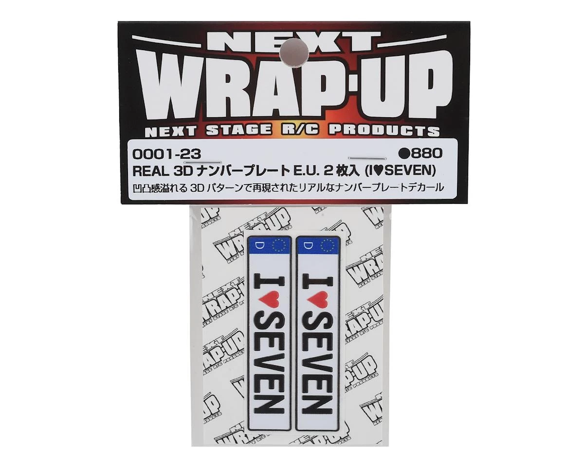 This is a set of two WRAP-UP NEXT REAL 3D E.U. License Plates with I LOVE SEVEN text, realistic textured decals of an Euro style license plate that can add scale depth to your RC drift car. The decal has been printed with 3D effects, giving it dimensions and details to the finished product. The license plates dimensions are 11x50mm (.5x2in).