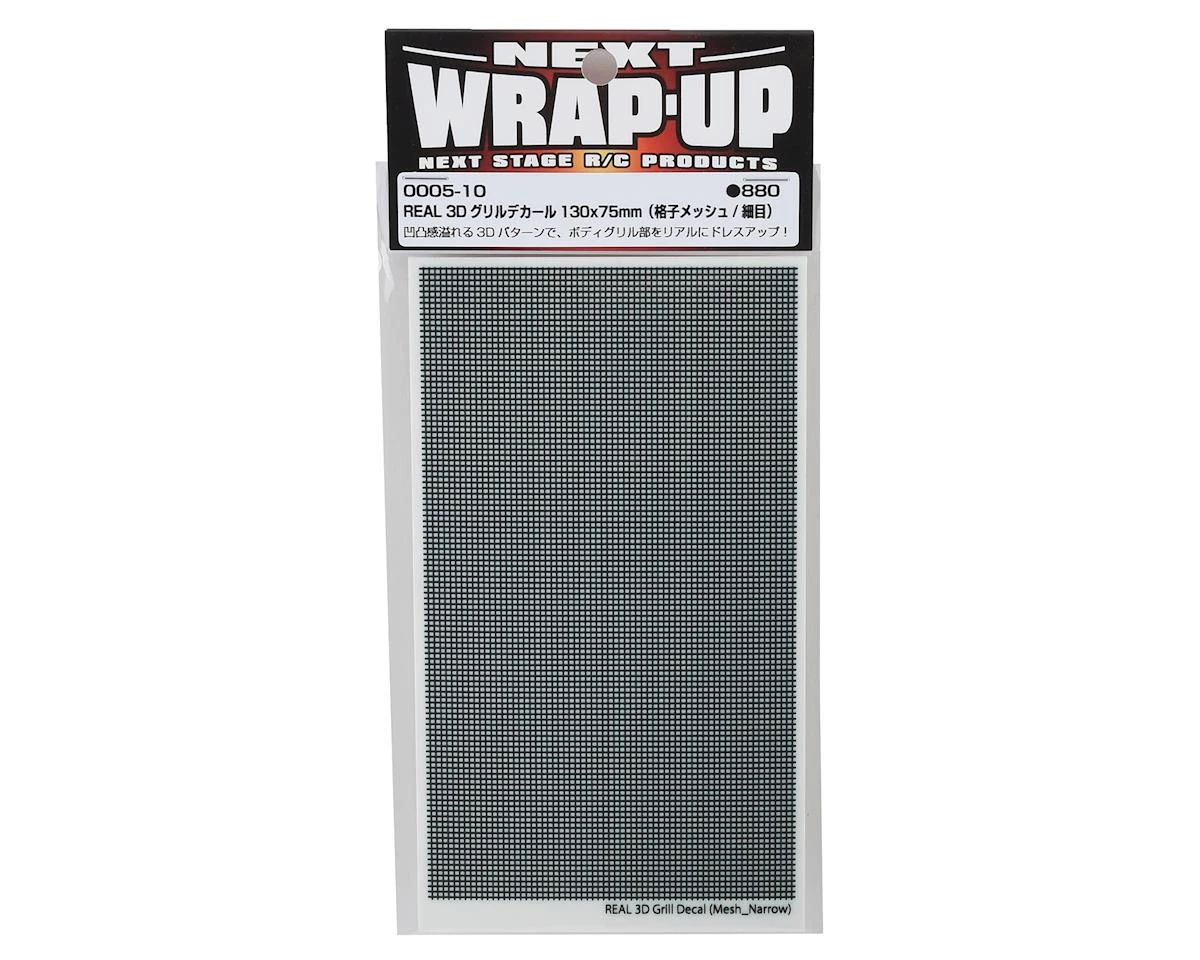 This is a WRAP-UP NEXT Silver 130x75mm (5x3in) REAL 3D Grid-Mesh-Thin Grill Decal, a textured set of decals to add realism to the grill of your RC drift car. This decal sheet has 3D effects for a greater depth of detail. Simply mask off the grill before painting, cut the decal to fit the desired grill and then apply to the inside of your drift body.