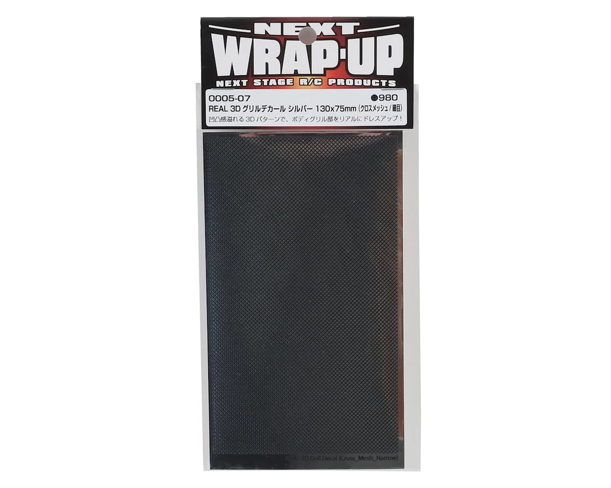 This is a WRAP-UP NEXT Black 130x75mm (5x3in) REAL 3D Silver Cross-Mesh/Thin Grill Decal, a textured decal to add realism to the grill of your RC drift car. This decal sheet has 3D effects for a greater depth of detail. Simply mask off the grill before painting, cut the decal to fit the desired grill and then apply to the inside of your drift body.Â