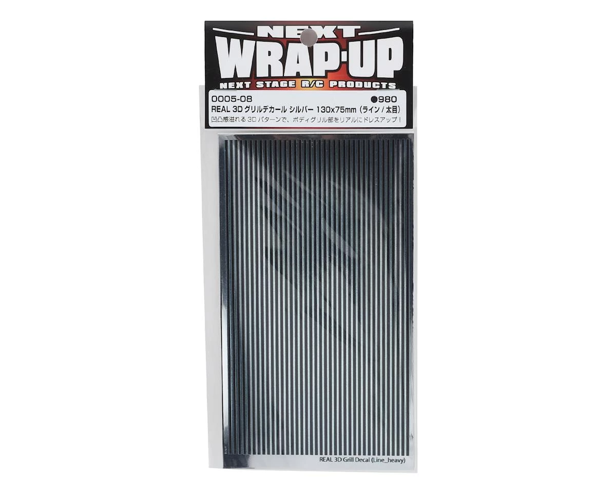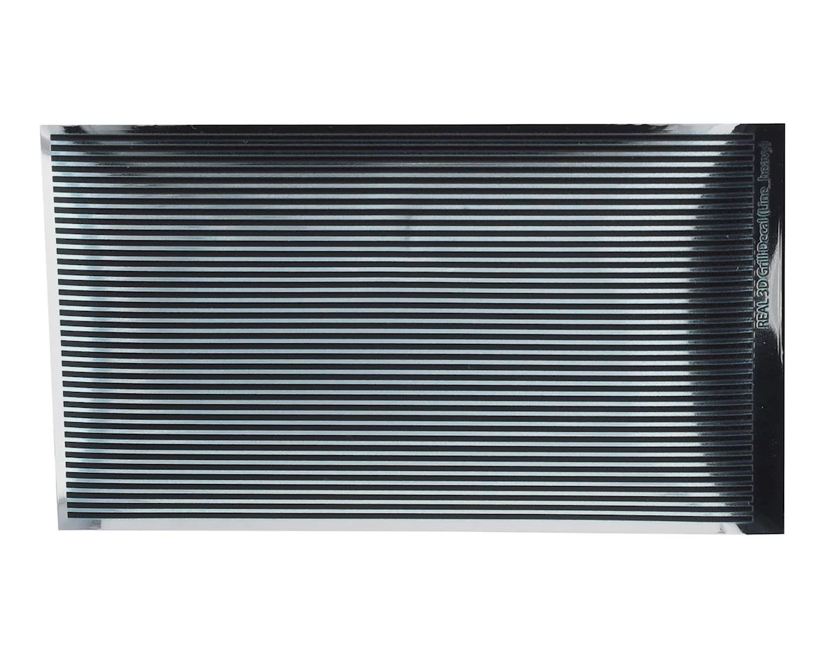 This is a WRAP-UP NEXT Black 130x75mm (5x3in) REAL 3D Silver Line-Wide Grill Decal, a textured decal to add realism to the grill of your RC drift car. This decal sheet has 3D effects for a greater depth of detail. Simply mask off the grill before painting, cut the decal to fit the desired grill and then apply to the inside of your drift body.