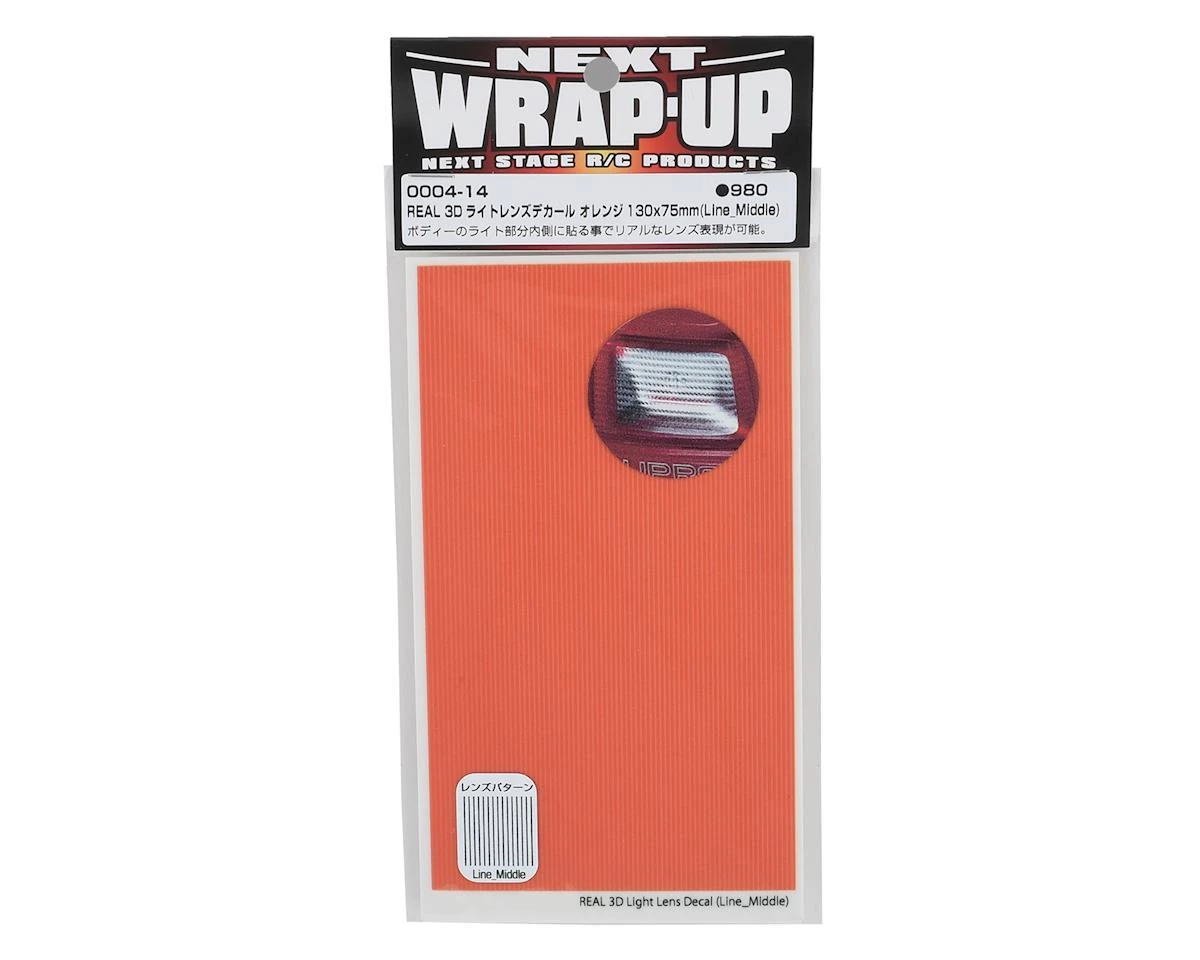 This is a WRAP-UP NEXT REAL 3D 130x75mm (5x3in) Line-Middle Orange Lens Decal, a decal to add realism to your rc drift set ups lights. This decal sheet has 3D effects, making them lightly textured to add further depth and details, especially when used with installed LEDS (not included). The decal is easy to cut to size and add to your body’s tail lights. Simple cut the decal in shape and place on the inside of the body for the best results.