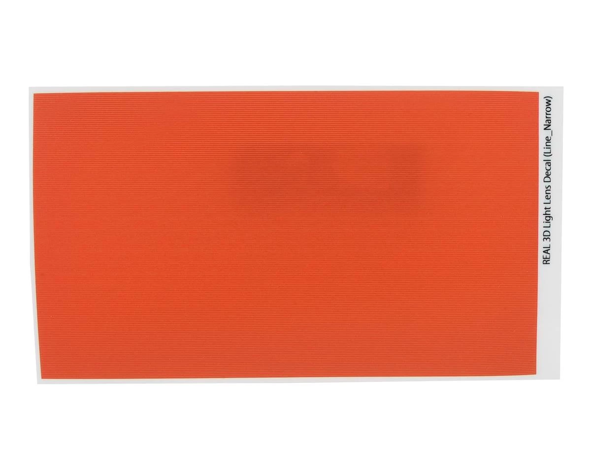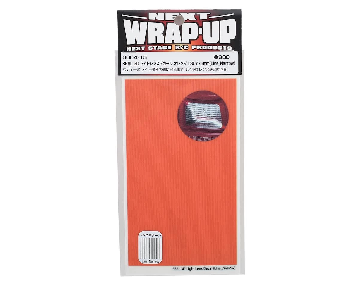 This is a WRAP-UP NEXT REAL 3D 130x75mm (5x3in) Line-Narrow Orange Lens Decal, a decal to add realism to your rc drift set ups lights. This decal sheet has 3D effects, making them lightly textured to add further depth and details, especially when used with installed LEDS (not included). The decal is easy to cut to size and add to your body’s tail lights. Simple cut the decal in shape and place on the inside of the body for the best results.