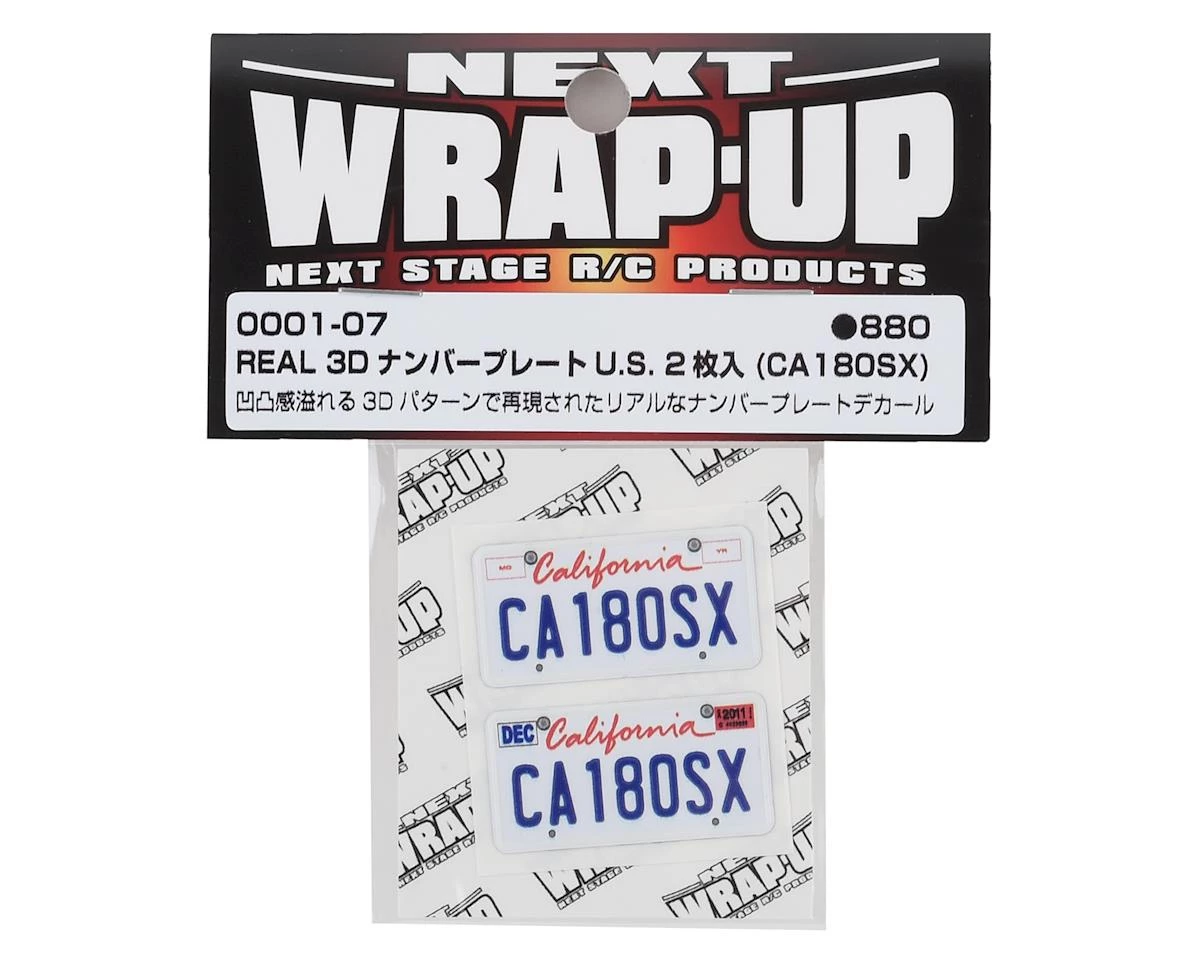 This is a set of two WRAP-UP NEXT REAL 3D U.S. License Plates with CA180SX text, realistic textured decals of an American style license plate that can add scale depth to your RC drift car. The decal has been printed with 3D effects, giving it dimensions and details to the finished product. The license plates dimensions are 11x50mm (.5x2in).