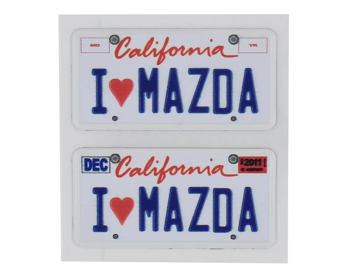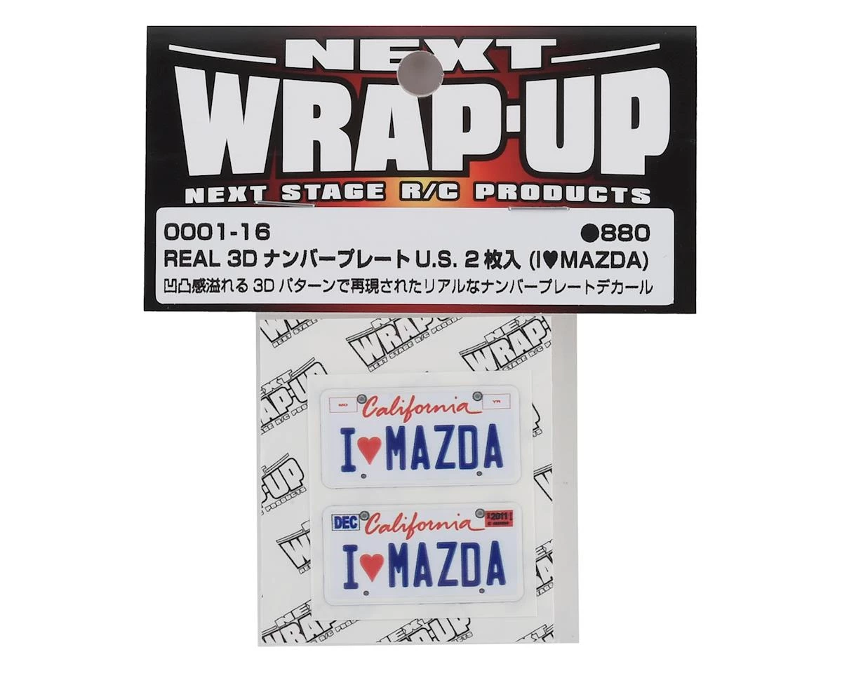 This is a set of two WRAP-UP NEXT REAL 3D U.S. License Plates with I LOVE MAZDA text, realistic textured decals of an American style license plate that can add scale depth to your RC drift car. The decal has been printed with 3D effects, giving it dimensions and details to the finished product. The license plates dimensions are 11x50mm (.5x2in).