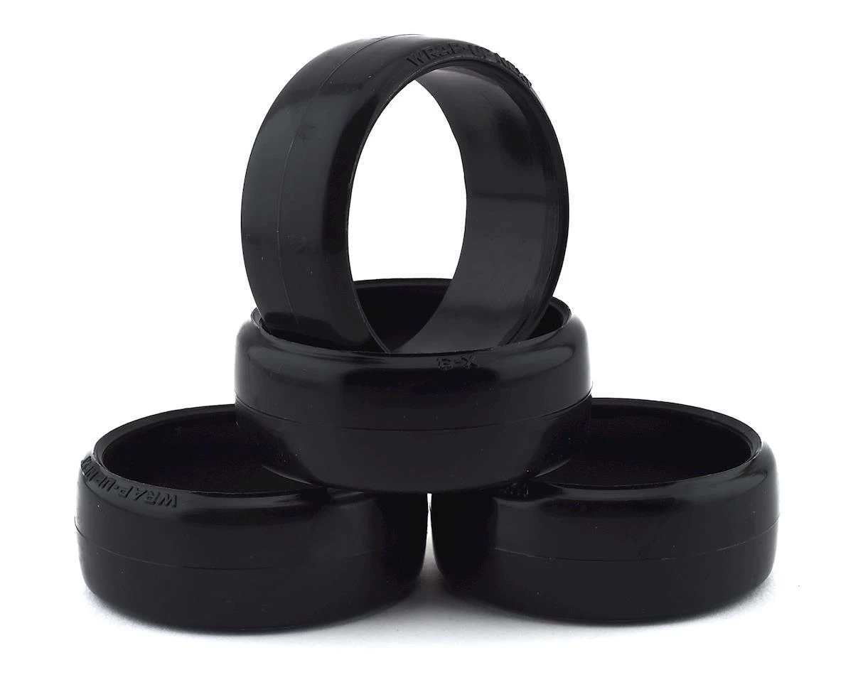 This is a pack of four WRAP-UP NEXT X-3 HDPE Drift Tires. These redesigned tires are dedicicated to two-wheel drive and made from a resin material in a rounded, stable configuration. This design makes the tires suitable for many drift surfaces. The pack includes four urethane fixing strips.